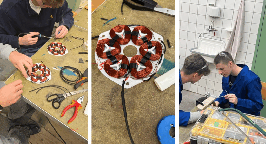 Another group wound coils and soldered the electronics. After completing the winding process, insulation was stripped from the ends of the wire and a thin layer of tin was put on the ends of the wire. Next, the corresponding ends were twisted and soldered together. Simultaneously several external wires were cut and connected to the loose ends of the coils. For the isolation shrink wrap was used.