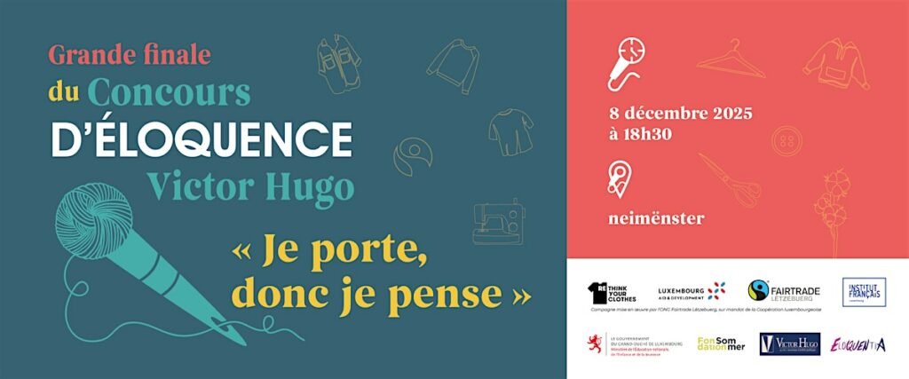Venez assister à lagrande finale du Concours d’Éloquence Victor Hugo “Je porte, donc je pense”, organisée par l’ONGFairtrade Lëtzebuergetl’Institut Français du Luxembourg,avec le soutien delaFondation Sommer et de l’Association Victor Hugo.