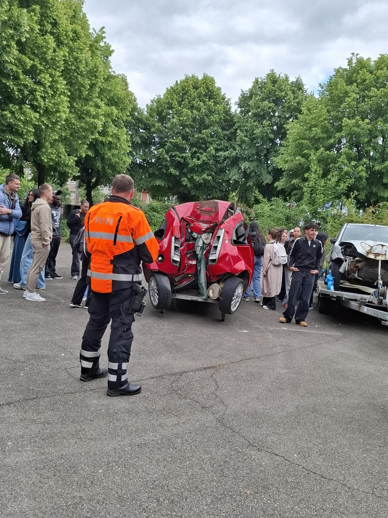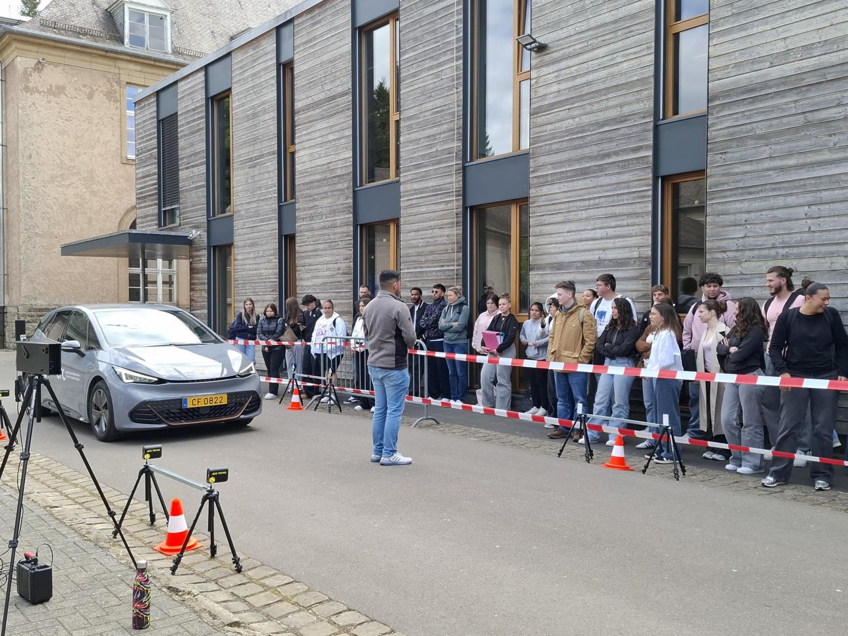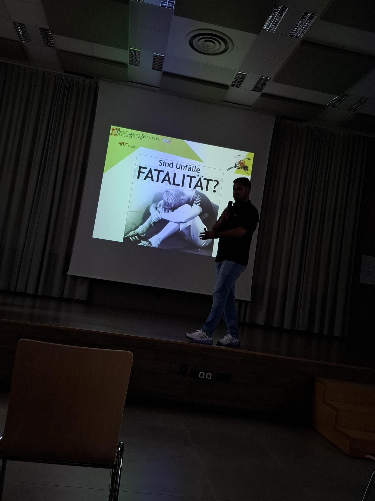 Nieft dem Personal aus dem Centre de Formation pour Conducteurs vu Colmar-Bierg war och ee Member vun der Police sur Place fir ze informéieren. Ugefaangen huet den Dag mat enger interaktiver Diskussioun am Festsall wou d’Schüler och Videoen a Statistike gewise kruten.