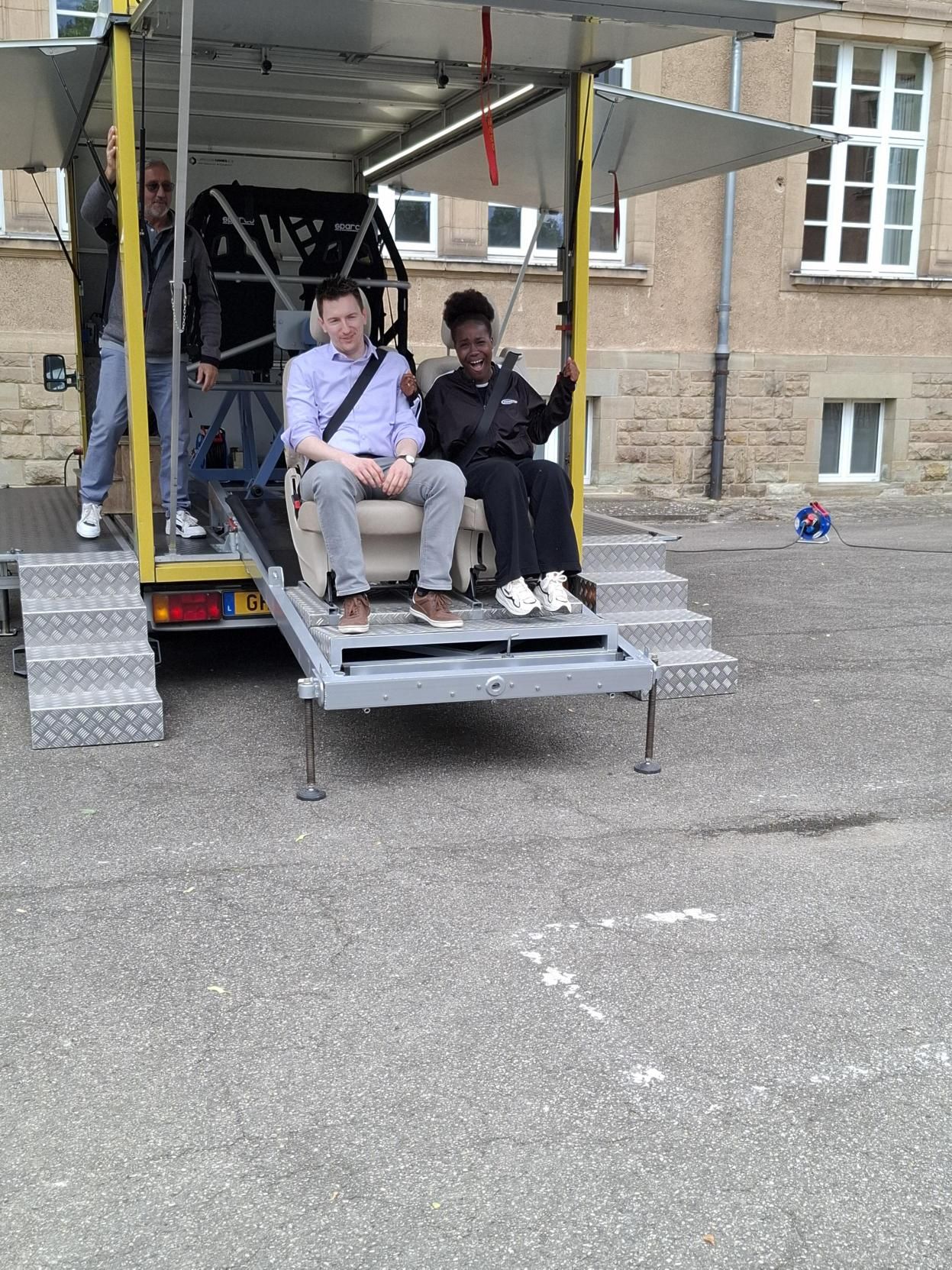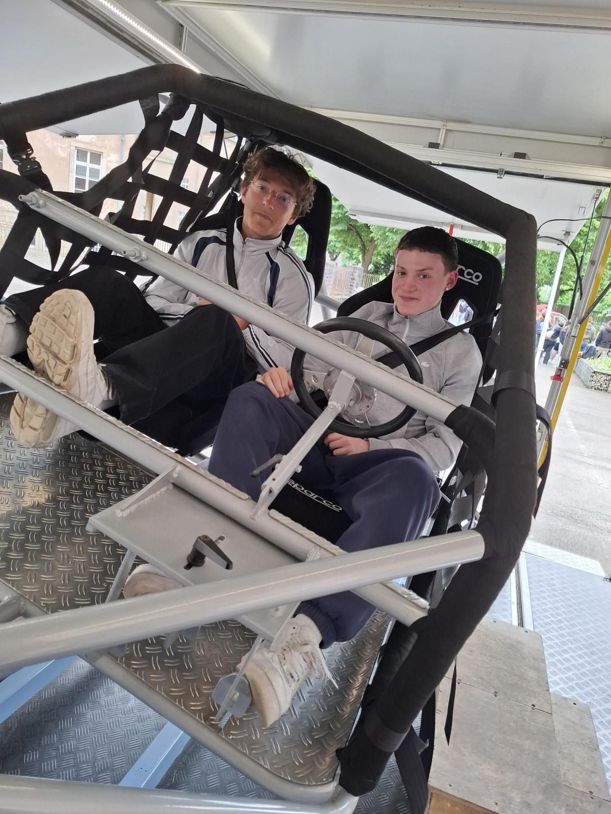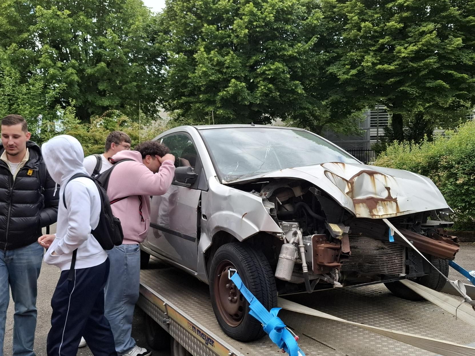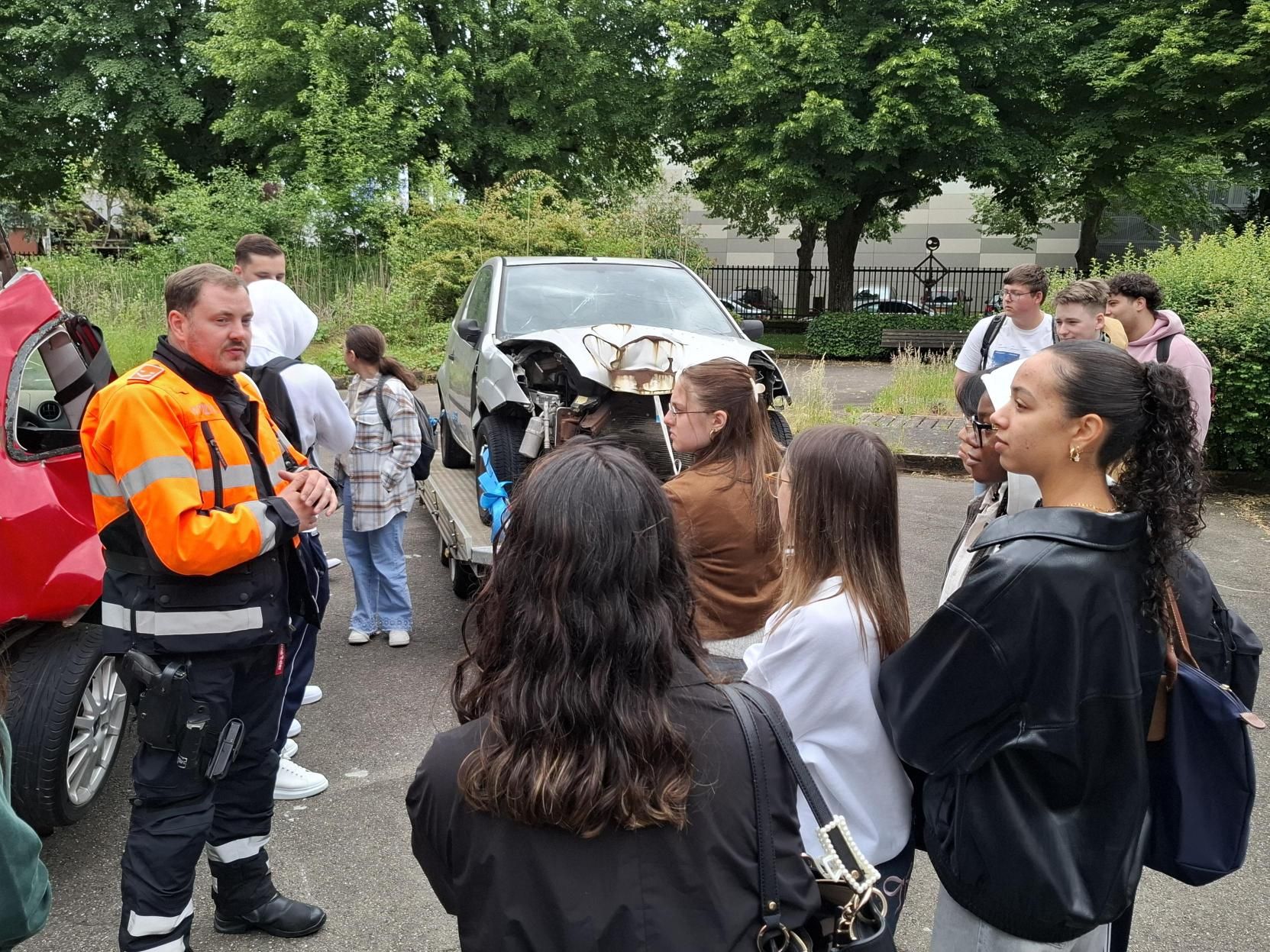 Dono ass et iwwergaangen an de prakteschen Deel a Form vu verschiddenen Atelieren, wéi ënnert anerem engem Gurtschlitt an engem Iwwerschlagsimulator, wou d’Schüler sech selwer konnte rasetzen an d’Impakter spieren. Et stoungen och 2 accidentéiert Autoen am Haff vun eiser Annexe an et gouf eng Bremsdemo gewisen.